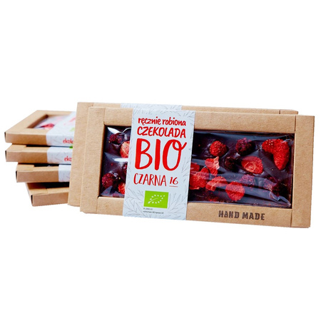 czekolada deserowa* (miazga kakaowa*, cukier trzcinowy*, tłuszcz kakaowy*, emulgator: lecytyny (z SOI*), jeżyna liofilizowana* (1,4 %), truskawka liofilizowana* (1,4 %) (*certyfikowany składnik ekologiczny)