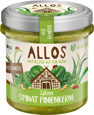 szpinak* (44 %), cebula* (18 %), nasiona słonecznika* olej słonecznikowy*, orzeszki piniowe* (3 %), syrop z agawy*, skrobia ziemniaczana*, czosnek* (2 %), koncentrat soku cytrynowego*, sól morska, musztarda* (woda, nasiona GORCZYCY*, ocet*, sól morska, przyprawy*), przyprawy* (cebula w proszku*, czarny pieprz*), substancja zagęszczająca: mączka chleba świętojańskiego* (*certyfikowany składnik ekologiczny)